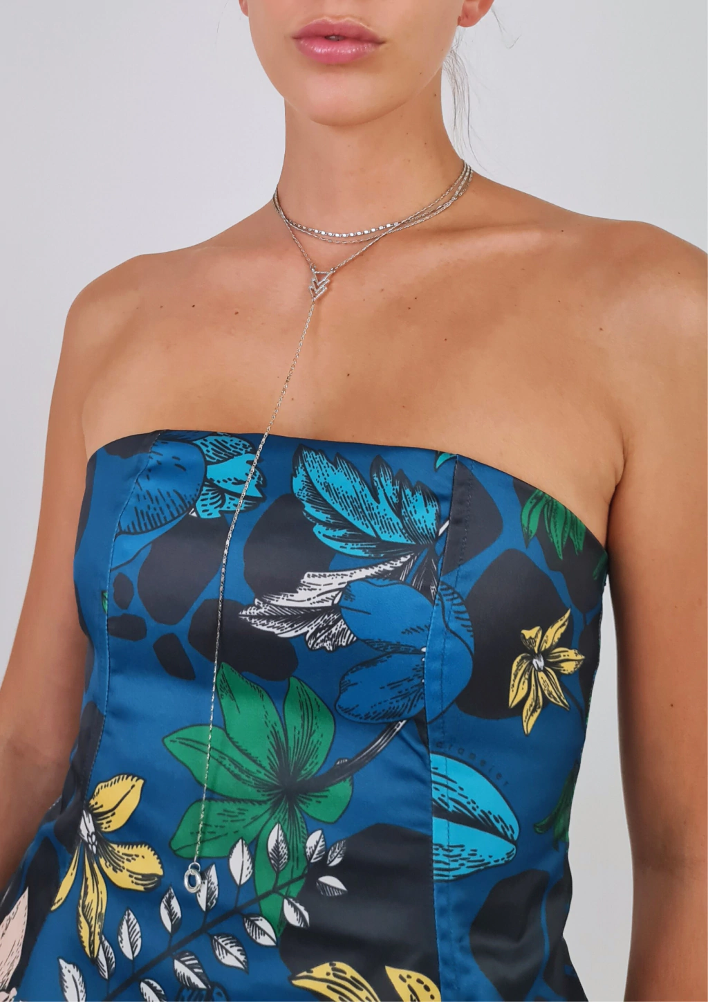 Nuestro Strapless Liatris está desarrollada en sate con spandex. Su diseño y estampa son exclusivos de Cara Meier.
